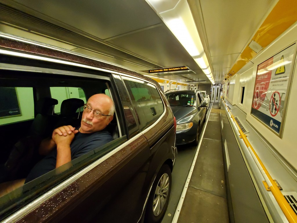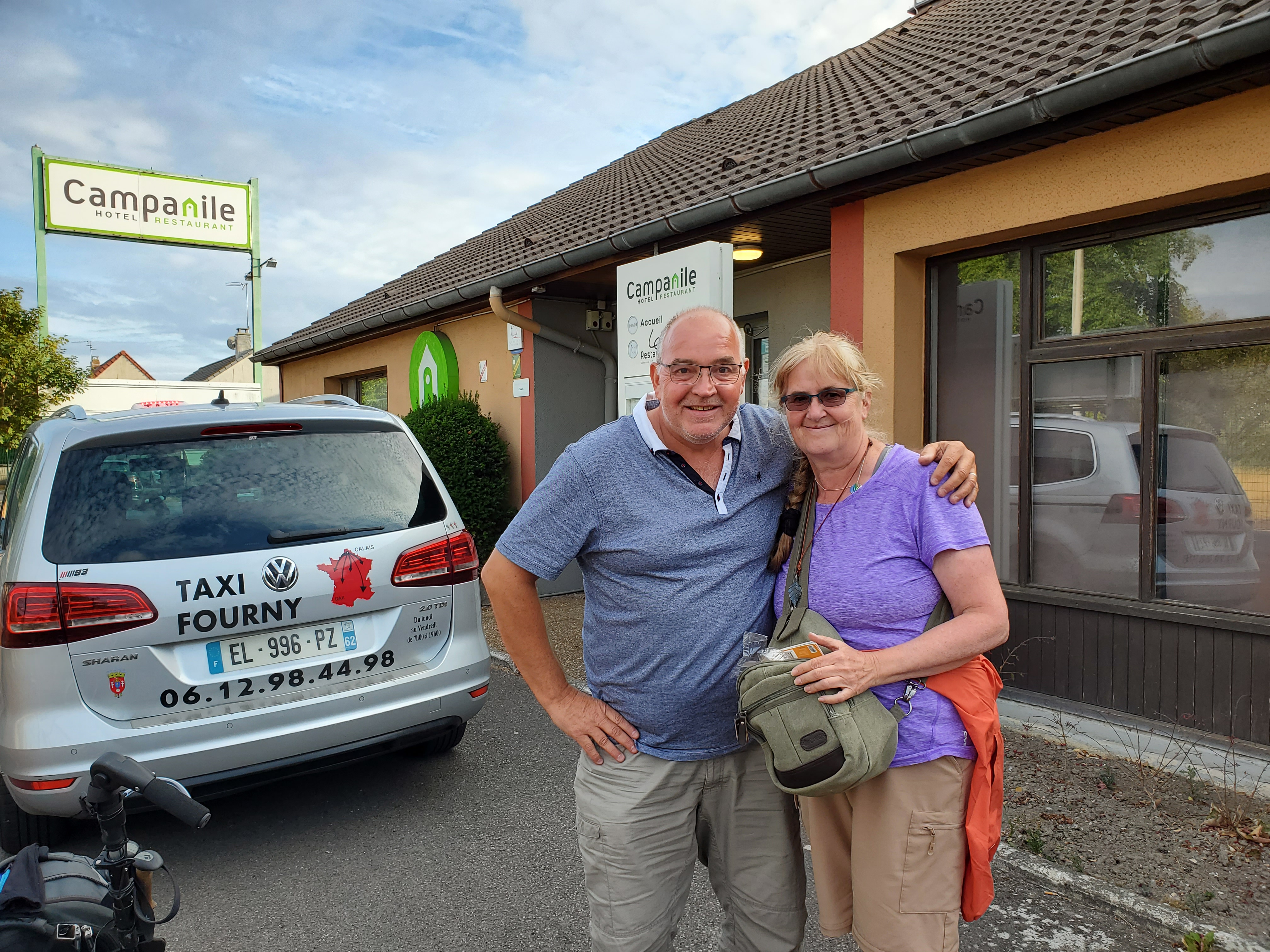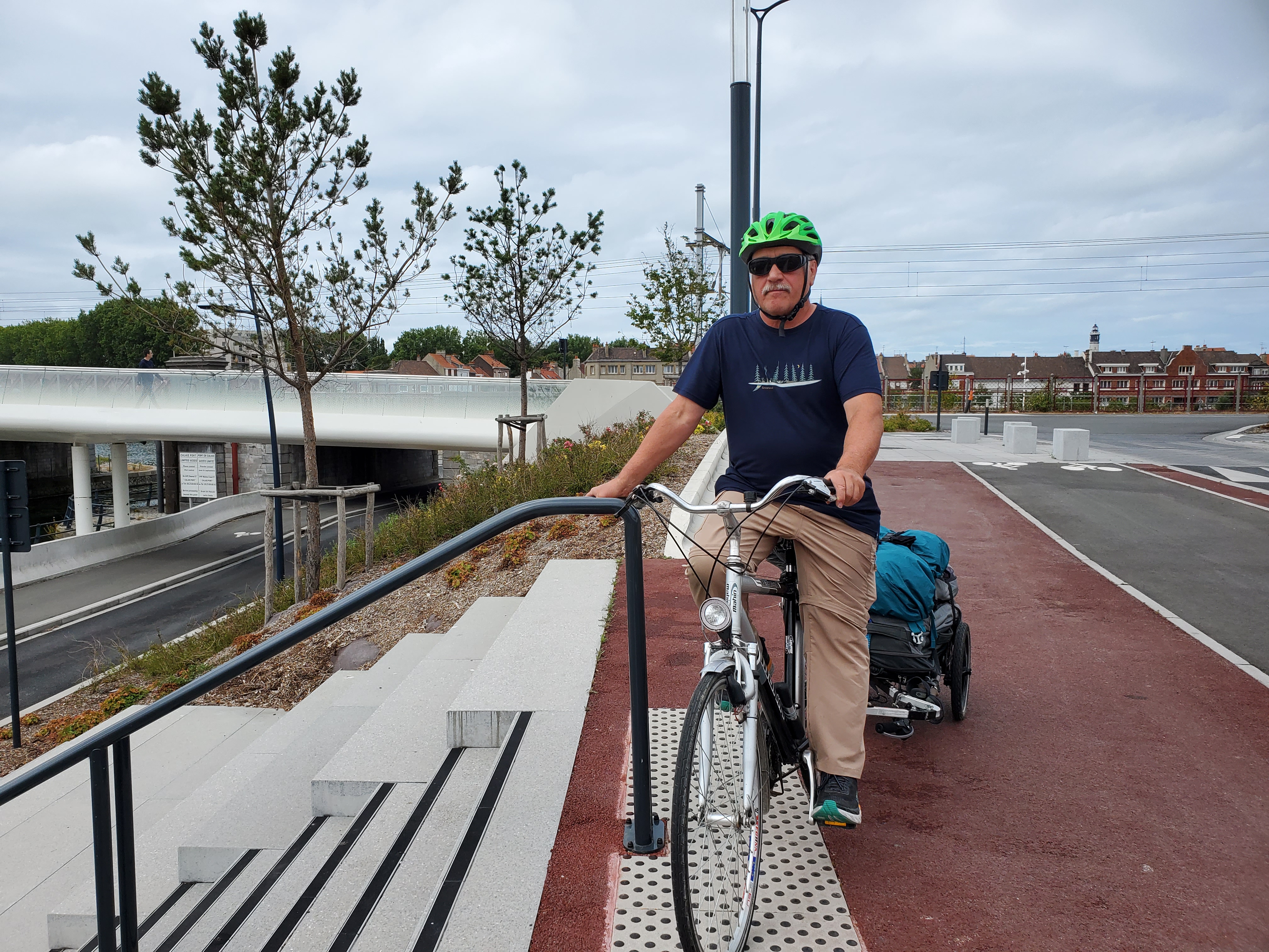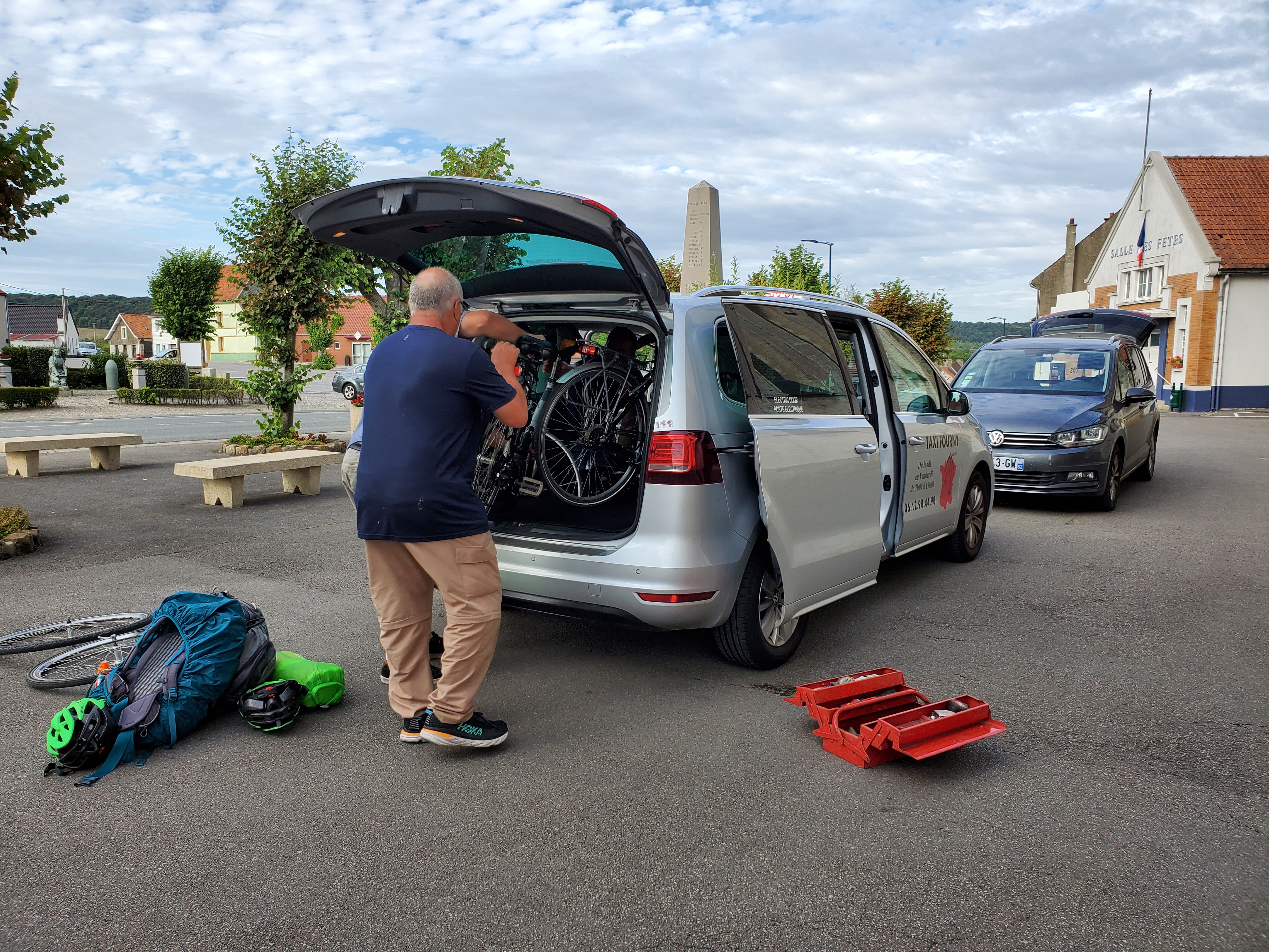 Picked up at 5:00 am from our guest house in Dover for our trip across the Channel to Calais. Setting my alarm for a number less than 6 is just wrong.Chilling line up of transport trucks waiting to cross. At one point they estimated 10000, yes, 10000 trucks in line. Dover port was a mess. So glad we decided on the train. And no wonder supply chains are disrupted.Ken was frightened that all the water from the English Channel would flood the chunnel. Our taxi driver tried to reassure him by asking “you brought your brolly, didn’t you, Ken?” 🤣3 tunnels..one for the passenger train (Eurostar), one for the car/truck train (Eurotunnel) and the escape tunnel which Ken was very interested in.Our driver Jonathan. Very entertaining and knowledgeable. Said the ticket prices had more than doubled since I booked. We all fell asleep whole on the train (being the excruciating early hour that we had to get up) and the joke became that Jonathan was an excellent driver but did fall asleep at the wheel.Finally picked up our bikes but headed out in the rain several hours later then we hoped.Bunger the Bugsnax with the Burghers of Calais. This statue by Rodin (he also did The Thinker) commemorates an incident in 1347 during the 100 Years War when Edward III demanded that 6 of the town’s 12 burgers sacrifice themselves so the town could be spared. The 6 men in turn were spared by Edward’s wife. Wives are good peoples!And off we go along the canal.Famous last words: this whole country is flat as a pancake, this should be easy!Aw…little peeping ducklings.8 cygnets!And then…oh no! Saint Theresa, help us! Bicycle breakdown. We were stuck by a church which happened to be open.So…after encountering unexpectedly long and steep hills (see aforementioned famous last words) and just after we crossed over the Eurostar rail line, Ken’s bike went kaput. We were 20 km from Calais. Ken being Ken he had picked up some twine along the way (Peter, we now have Stringy 3) and just like on the Camino it came in handy for some first aid on the bike…broken derailleur. He tied the derailleur up with the twine so he could at least glide down the hills to get to the next town. And push-up.The bike shop was not answering our calls and I remembered I had the card for a taxi driver I had hired earlier that day. I hoped he would remember me as we had sung along to the Village People’s YMCA together. He spoke some English and agreed to drive out to get us and take us back to Calais.Saw lots of baby bunnies while we were waiting but they were too fast.Just how many times are we going to stuff our bikes and trolley into strange cars? I have lost count. Christopher our Camino angel of the day. As a taxi driver he went above and beyond helping us out, even calling his son to bring tools to take the bikes apart. He wanted to know why we didn’t call him right away rather than pushing the bike 5 km. I blame getting up at 5:00 am for not thinking straight. It’s always a good day when it ends with beer! We managed to book a hitel at the end of the day, which wasn’t easy with all the holiday channel traffic.The Google car?