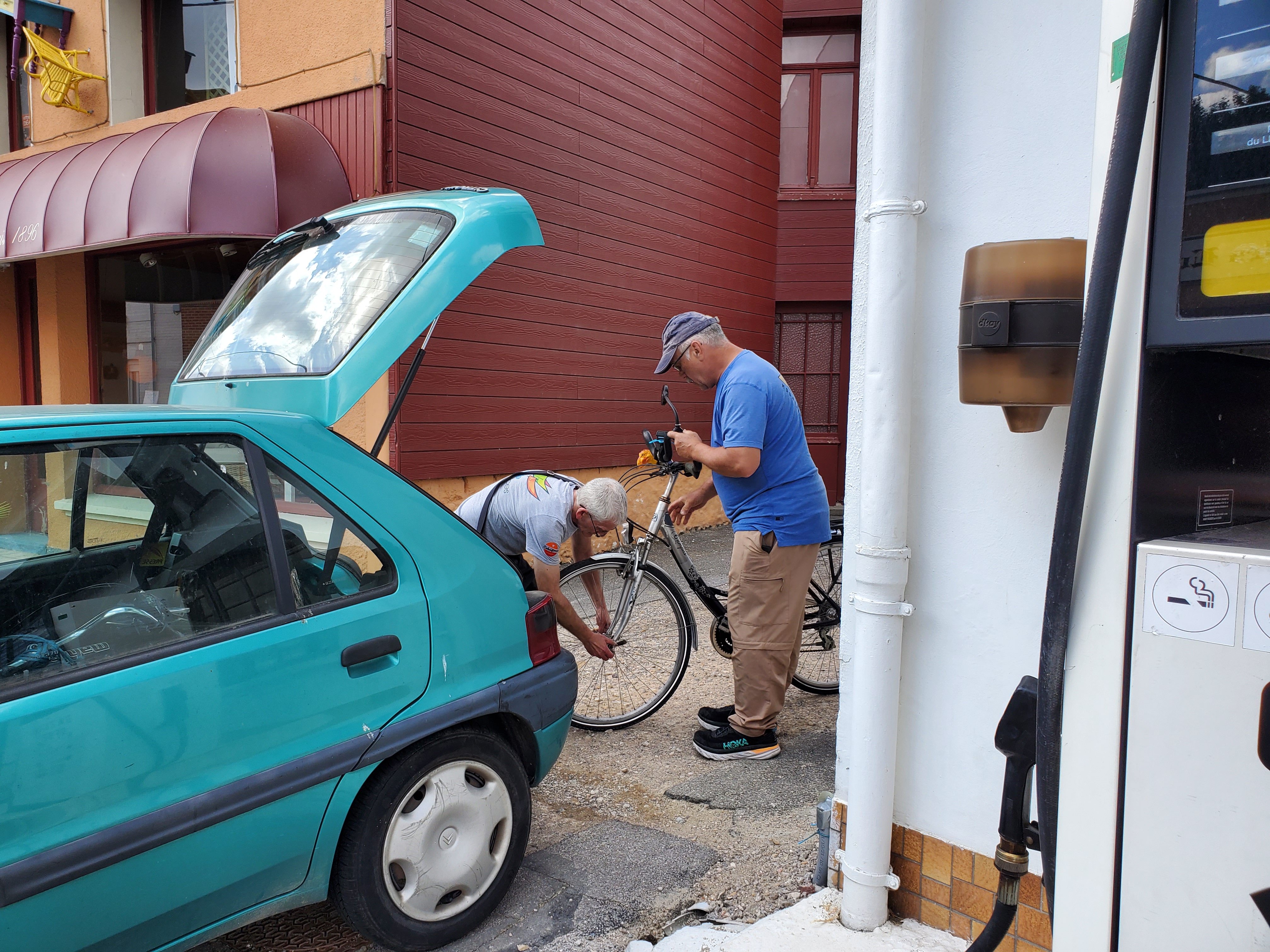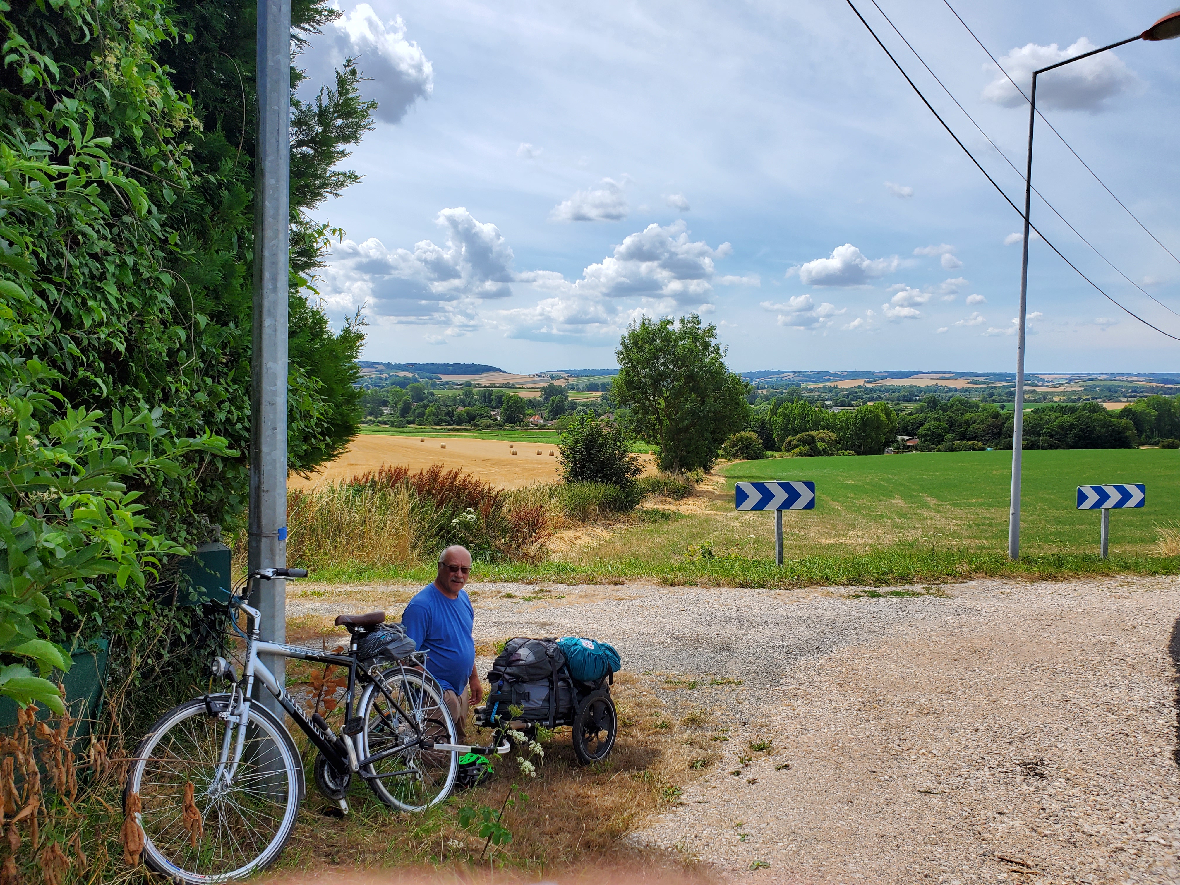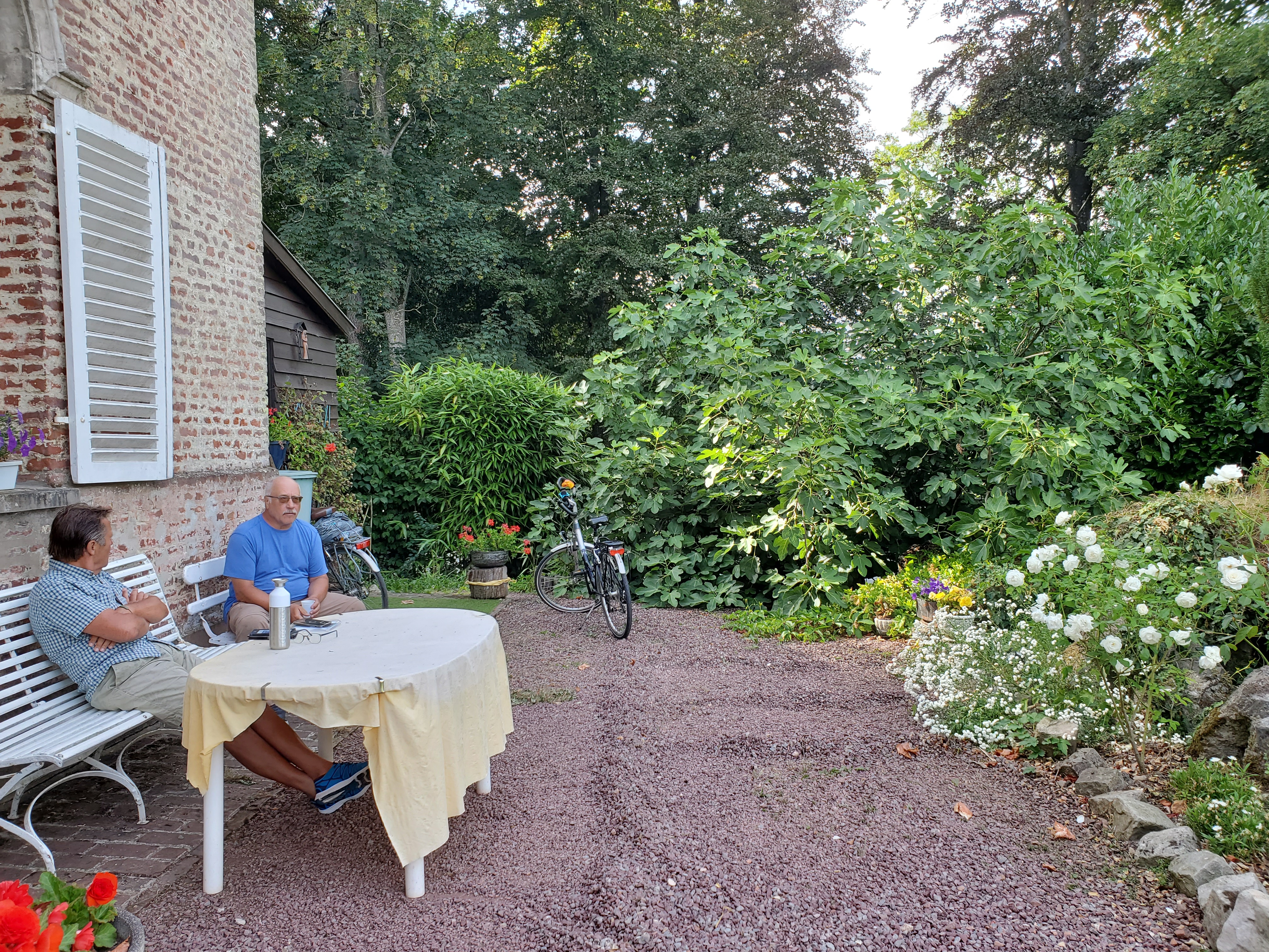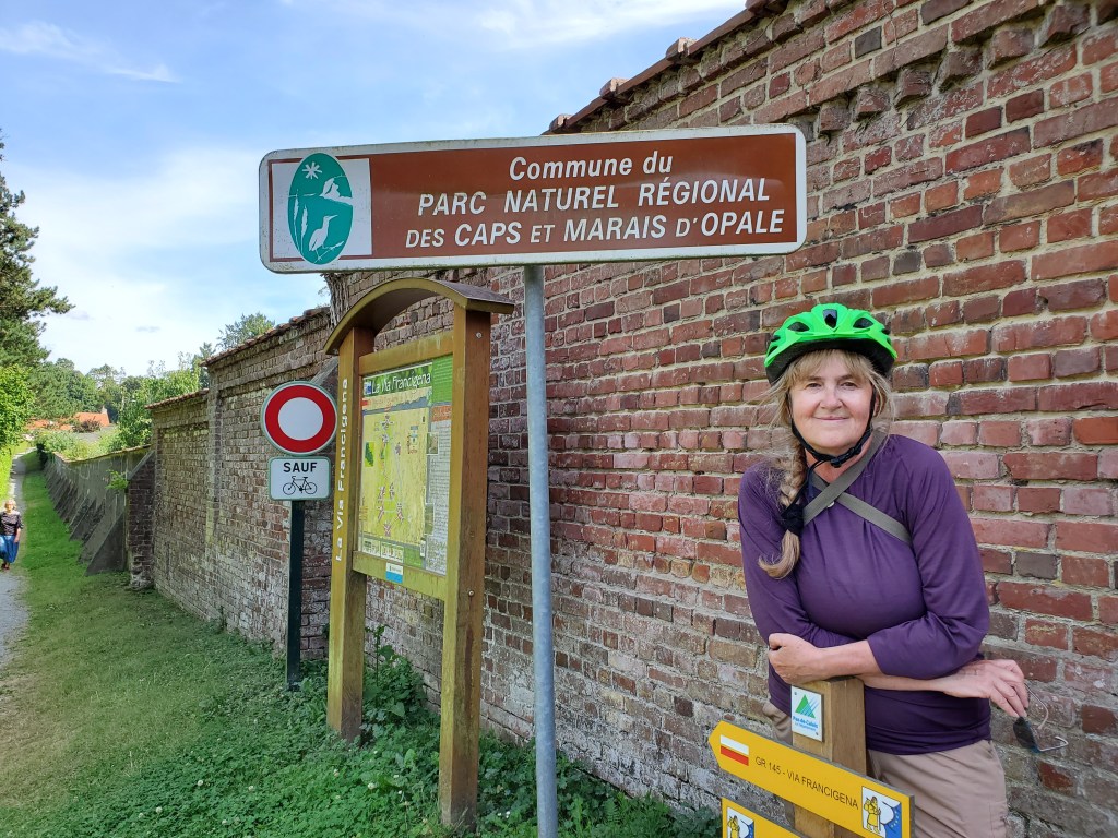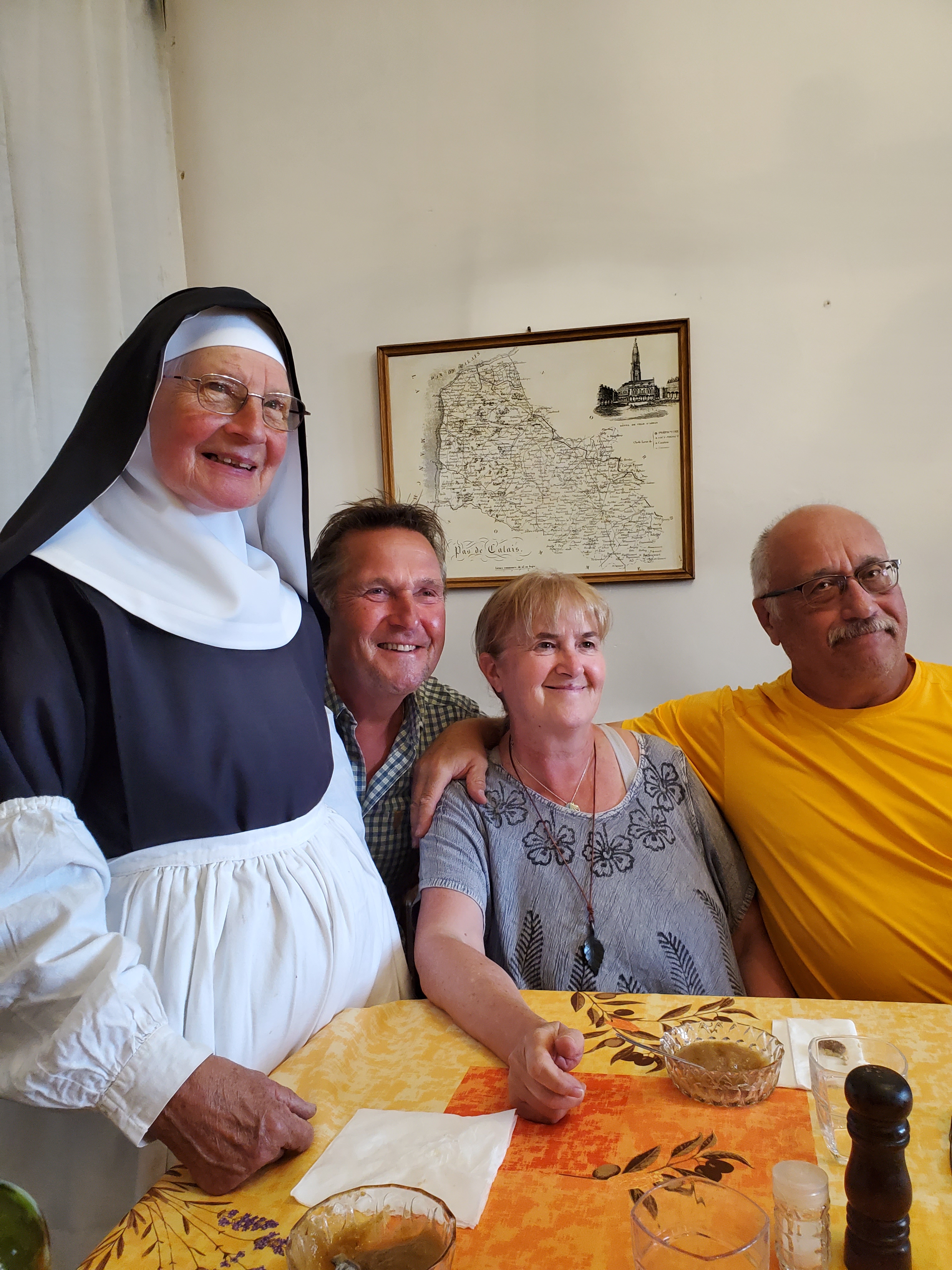 The day started off with a good breakfast, Canada Grade A maple syrup, and another ca to Christophe to ferry Ken, Rawley the Trolley and the broken bicycle back to the bike shop.I rode my bike back…loved this road filled with balloons.They opened the bikecshop an hour early for us. The Snax tried out this bicycle built for three.The man can sleep anywhere!Walking around while waiting for the bike to be repaired. You can certainly see the difference between the Cathic churches in France and the more austere Anglican churches in England. They had houseants in this one. And 3 more candles for our parents and Ryder.Look closely and you will see this is a peacock, with the lower garden its tail.Ken’s favourite place. He had waited there the day before while I ran errands and he became smitten with the sweet Stephanie. So back we went for a second day. At least she wasn’t a hungover New Brunswicker like the last woman he tried to dump me for on our 2019 Camino.They have the cutest little busses! I want one.The bicycle guy was kind enough to take us back to Licques where we had finished the day before but he had to make 2 trips. So we waited in a bar. Surprise surprise. I see a lot of this pottery around d here…classiest beer pulls ever!And yet another vehicle. How did he get 2 bicycles into that small car?Frédéric from the bike store…Camino angel of the day.Stringy 3. Long Camino story as to why it is so named.Even the bread store has classy ceramics.A lot of pushing and pulling up the hills.Much needed break…and the hill got steeper!This very angry turkey was guarding his chicken flock. He kept coming closer and closer, huffing and hissing and gobbling. I have great video but it is too long to post.We loved the sight of water towers because it meant we were at the top of the hill.Me: I want this!Also me: I want her too. Cutest long hair dalmatian.Still on route.And still smiling, oddly enough. Many big hills today. Famous last words: they can’t get any worse!Our digs for the night…Abbey of Notre Dame at Wisques. Not too shabby.Ken knows true joy when for the first time he did not have to haul the trolley up any flights of stairs.Ken can always find someone to talk to. Outside our small house.Sister Lucie, who sang Grace, and Jan from Holland and our 3rd pilgrim on the Via.Communal meal: soup, a slice of ham with Spanish rice and a tiny pickle if you were fast enough (Jan was not, although he and Ken did polish iff the wine), and apple compote and one cookie. Everything was carefully counted so you only got one. A simple convent meal.Our house.Bikes are parked for the night.