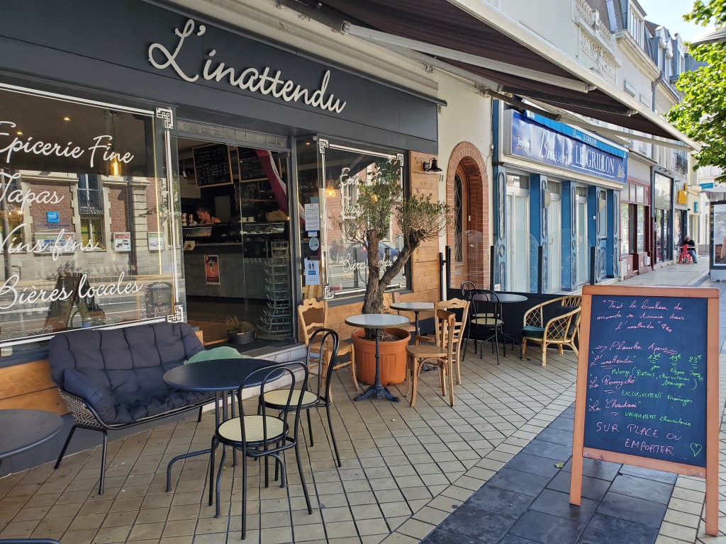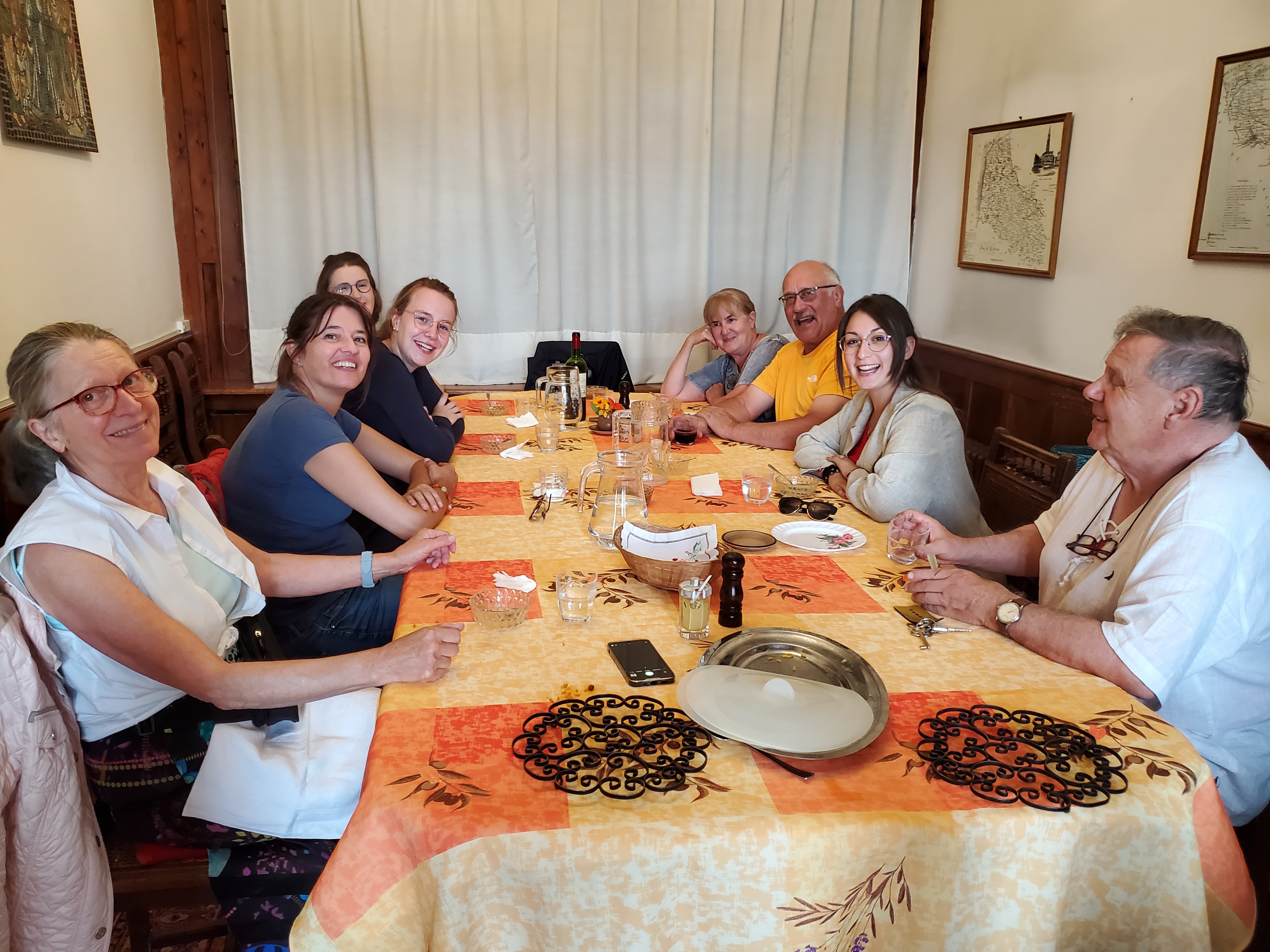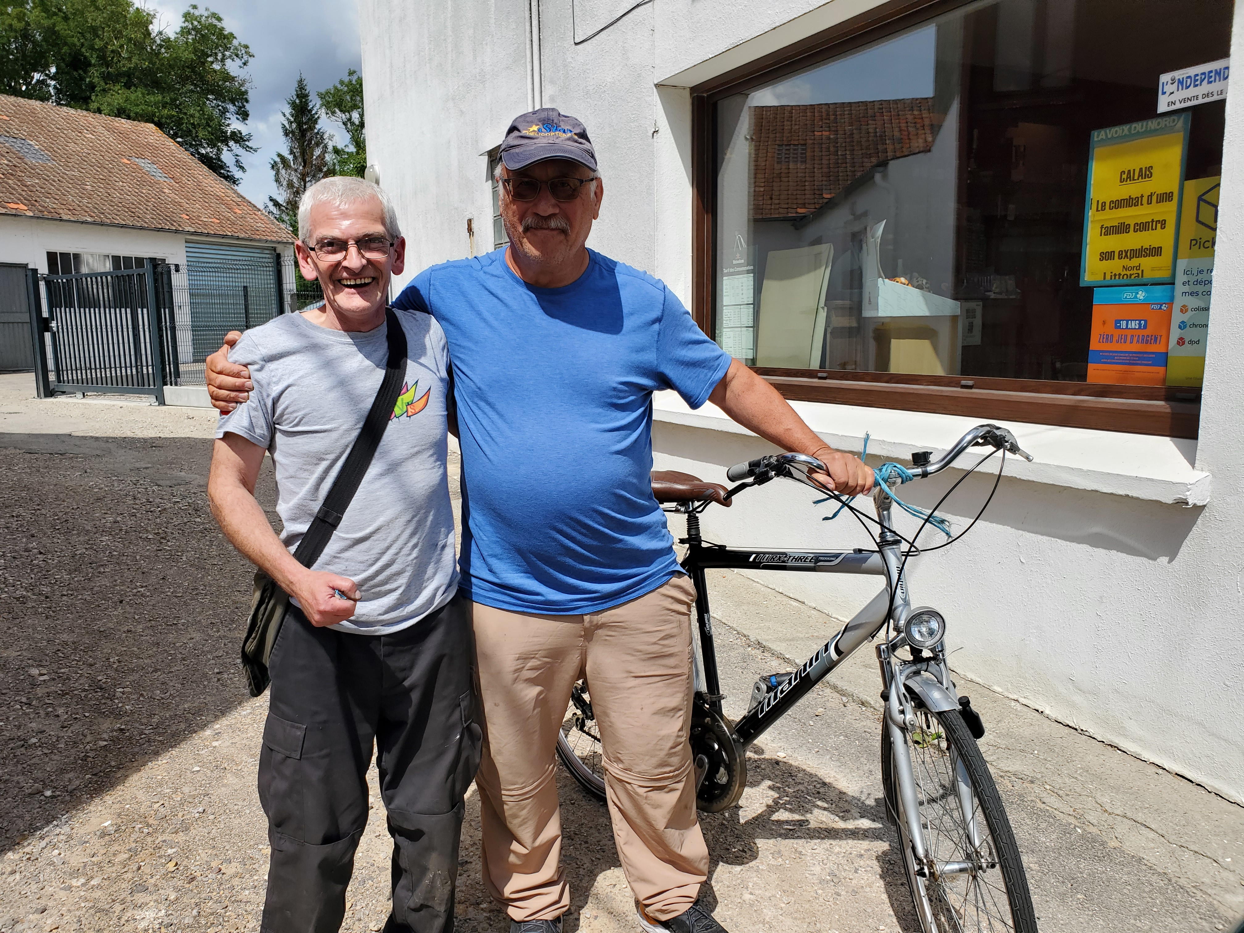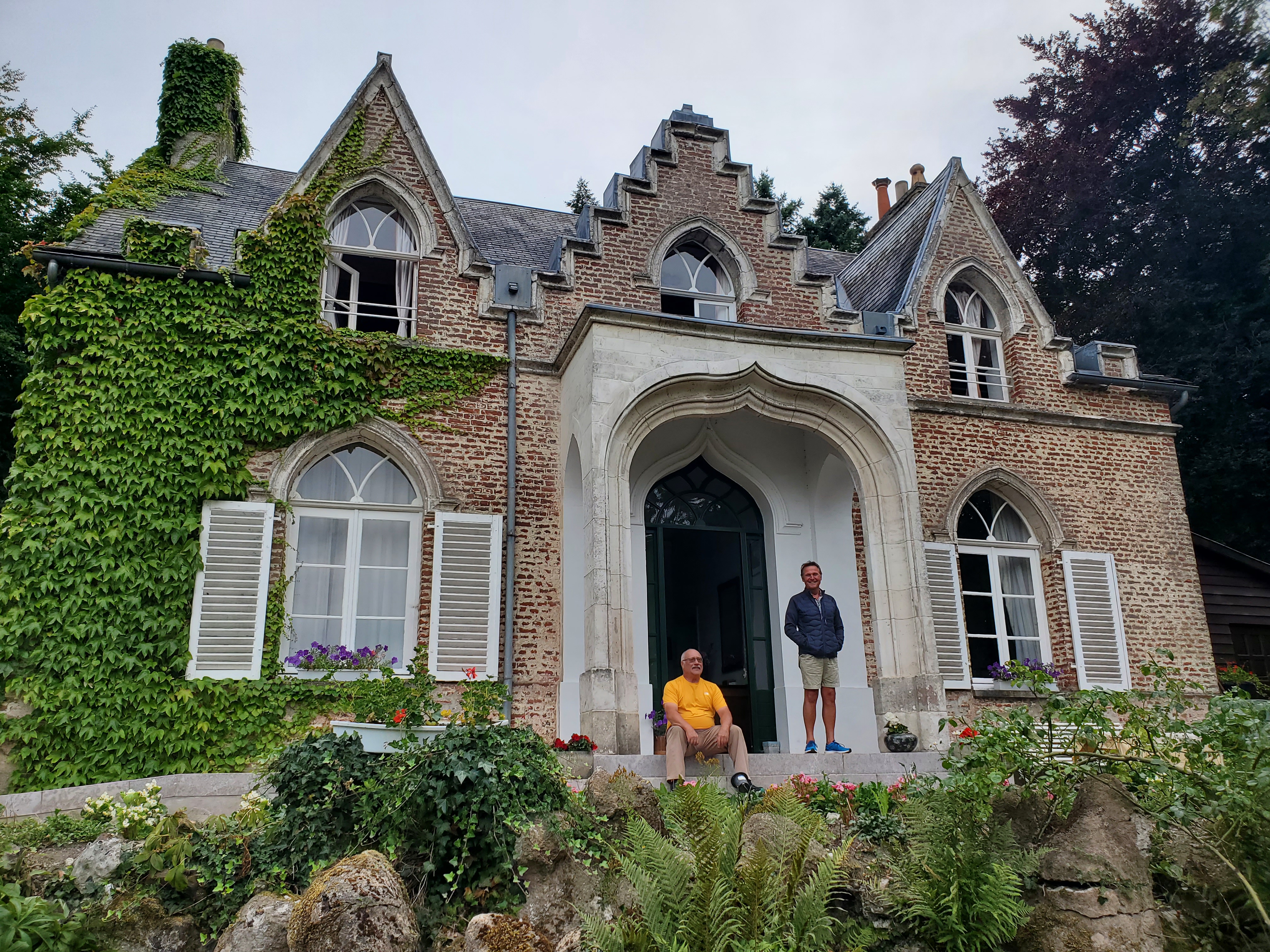 The day started off with a good breakfast, Canada Grade A maple syrup, and another ca to Christophe to ferry Ken, Rawley the Trolley and the broken bicycle back to the bike shop.I rode my bike back…loved this road filled with balloons.They opened the bikecshop an hour early for us. The Snax tried out this bicycle built for three.The man can sleep anywhere!Walking around while waiting for the bike to be repaired. You can certainly see the difference between the Cathic churches in France and the more austere Anglican churches in England. They had houseants in this one. And 3 more candles for our parents and Ryder.Look closely and you will see this is a peacock, with the lower garden its tail.Ken’s favourite place. He had waited there the day before while I ran errands and he became smitten with the sweet Stephanie. So back we went for a second day. At least she wasn’t a hungover New Brunswicker like the last woman he tried to dump me for on our 2019 Camino.They have the cutest little busses! I want one.The bicycle guy was kind enough to take us back to Licques where we had finished the day before but he had to make 2 trips. So we waited in a bar. Surprise surprise. I see a lot of this pottery around d here…classiest beer pulls ever!And yet another vehicle. How did he get 2 bicycles into that small car?Frédéric from the bike store…Camino angel of the day.Stringy 3. Long Camino story as to why it is so named.Even the bread store has classy ceramics.A lot of pushing and pulling up the hills.Much needed break…and the hill got steeper!This very angry turkey was guarding his chicken flock. He kept coming closer and closer, huffing and hissing and gobbling. I have great video but it is too long to post.We loved the sight of water towers because it meant we were at the top of the hill.Me: I want this!Also me: I want her too. Cutest long hair dalmatian.Still on route.And still smiling, oddly enough. Many big hills today. Famous last words: they can’t get any worse!Our digs for the night…Abbey of Notre Dame at Wisques. Not too shabby.Ken knows true joy when for the first time he did not have to haul the trolley up any flights of stairs.Ken can always find someone to talk to. Outside our small house.Sister Lucie, who sang Grace, and Jan from Holland and our 3rd pilgrim on the Via.Communal meal: soup, a slice of ham with Spanish rice and a tiny pickle if you were fast enough (Jan was not, although he and Ken did polish iff the wine), and apple compote and one cookie. Everything was carefully counted so you only got one. A simple convent meal.Our house.Bikes are parked for the night.