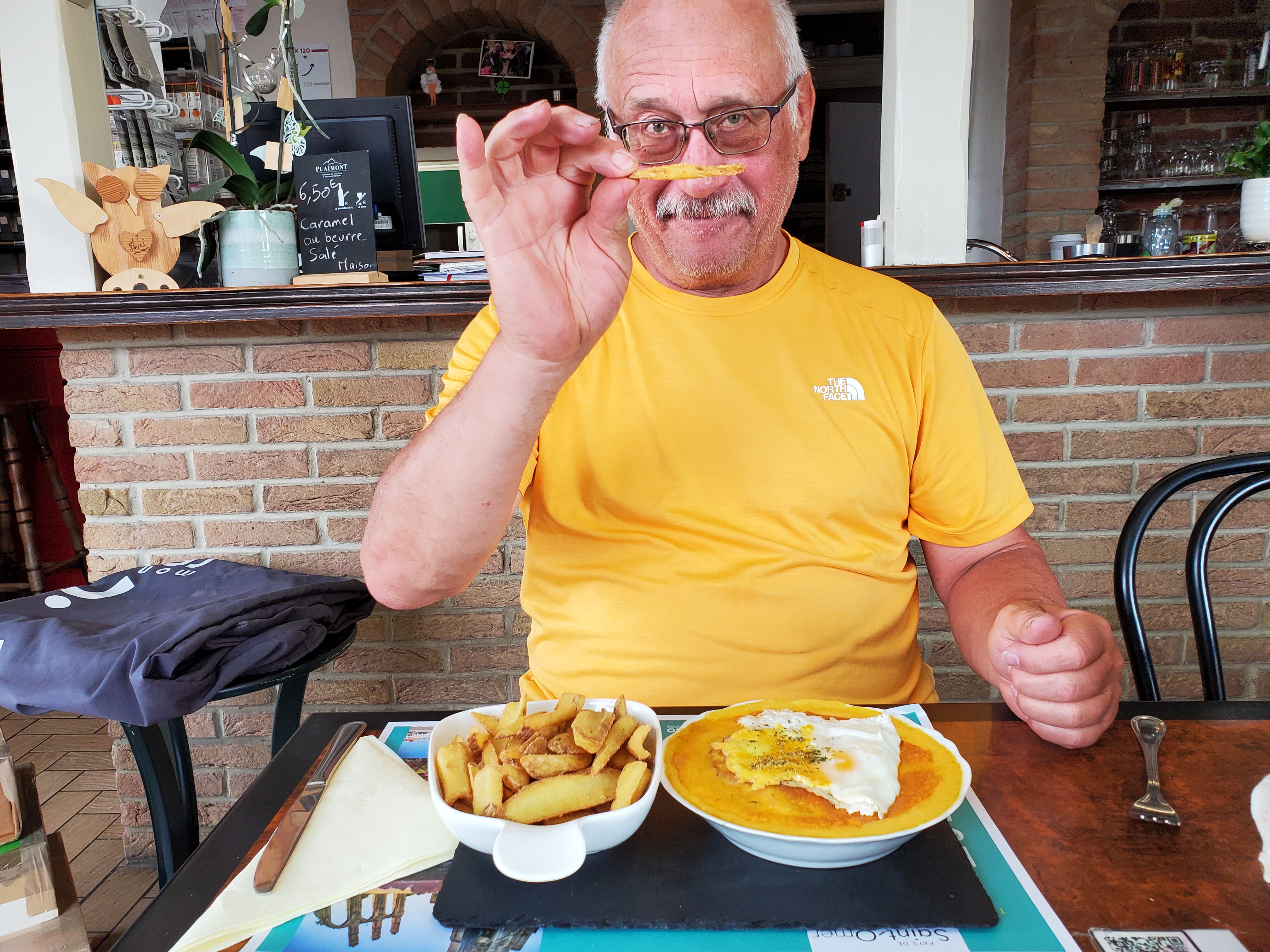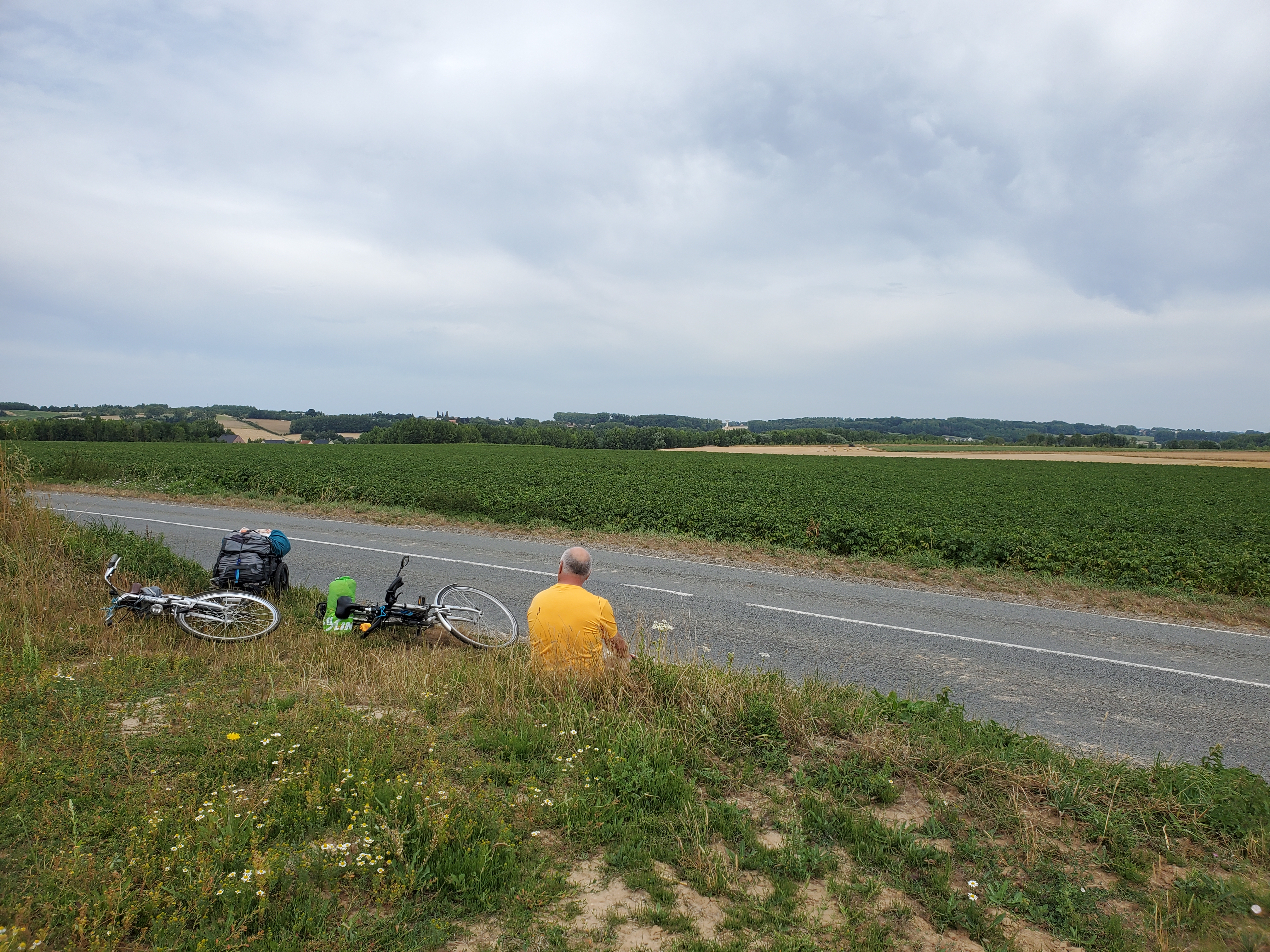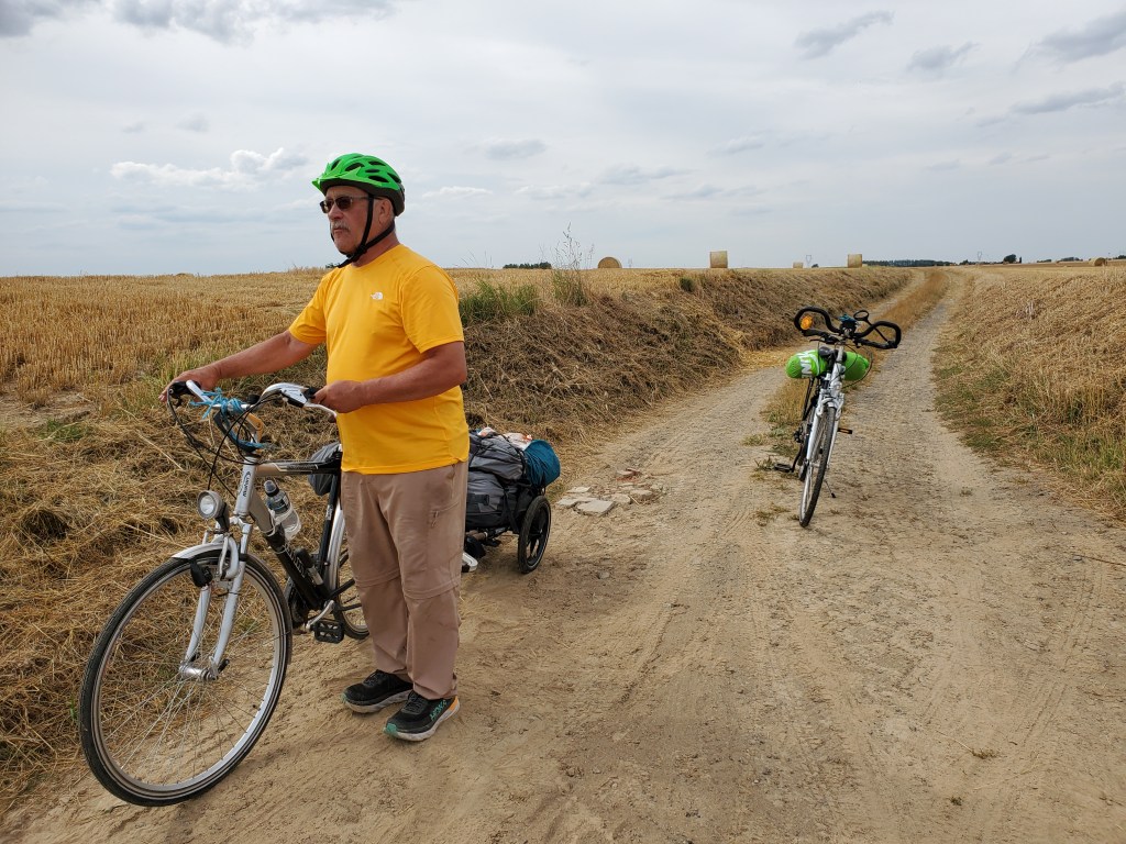 Which way do we go?La Welsch. One heck of a gas station meal. 2 pieces of toast with ham, smothered in cheese sauce and broiled with beer. Heart attack in a bowl.This is a gas station??? It actually has charm…and a bar. Which Ken took advantage of.Crucifixes in some form or another in every village.Well, they are not shells or yellow arrows but they will suffice.Monkey puzzle tree…have only seen them in Vancouver / Victoria.Local school children pasted these cow pictures onto the wall. We especially liked this evil cow by Hugo. Hugo is most likely a stinker! Kinda like Ken.Our token tourist visit to the Eiffel Tower…or some version thereof.Ken: Yes??? Terry: Non!Call to the John Deere repairman.Incredible hills to climb. Gotta admire the brawn on this guy. Not only is he “poussez”ing the bike, he is “tirez”ing Rawley the Trolley. Ken says pretty good for a fat old man.Passed a “Templar” hotel…and that is a real drawbridge over a moat.Not meaning to be disrespectful by photographing a gravestone but there is such a stark contrast between this and the ancient cemeteries we saw in England.This translates to Hanne Albert, Age 22, shot right here by a German sentry. Ken says at this time of WW2, France had already surrendered to the Germans. So why shoot this young man?Really, Googlemaplady, really???Le random rogue village chicken. Ken was terrified!Our Gite for the night. Ferme de 2 tilleuls. They cater to pilgrims. Tilleuls are linden trees.Ken pretending he knows how to hard boil eggs.Pigeon coop.Melle and Inga, Via Francigena pilgrims from Estonia.Outside the gite. St Joseph…someone tends these as there are often fresh flowers. Ken has yet another brilliant idea (Insert Terry eye roll here). Hang a car deodorizer in his arm pit so he never has to shower. Woe is me.