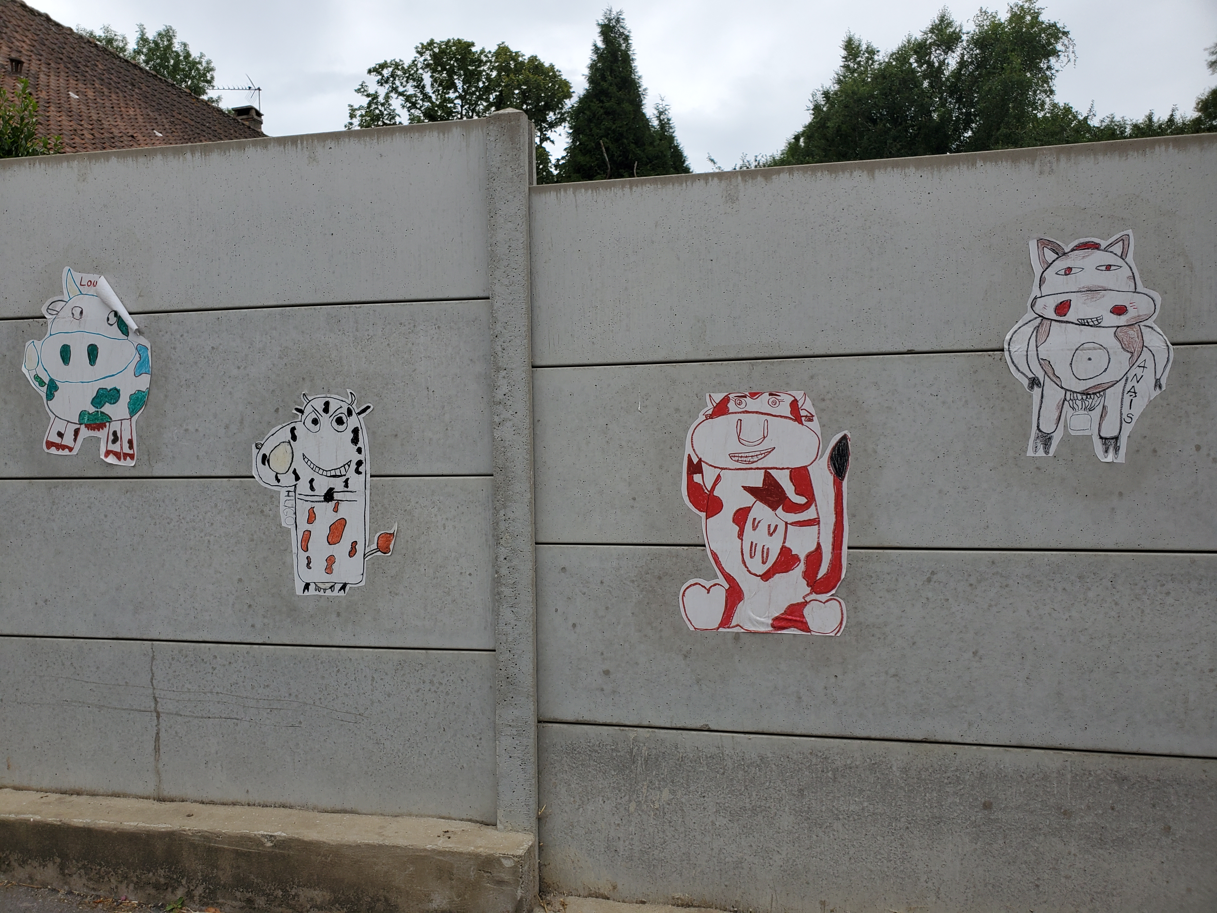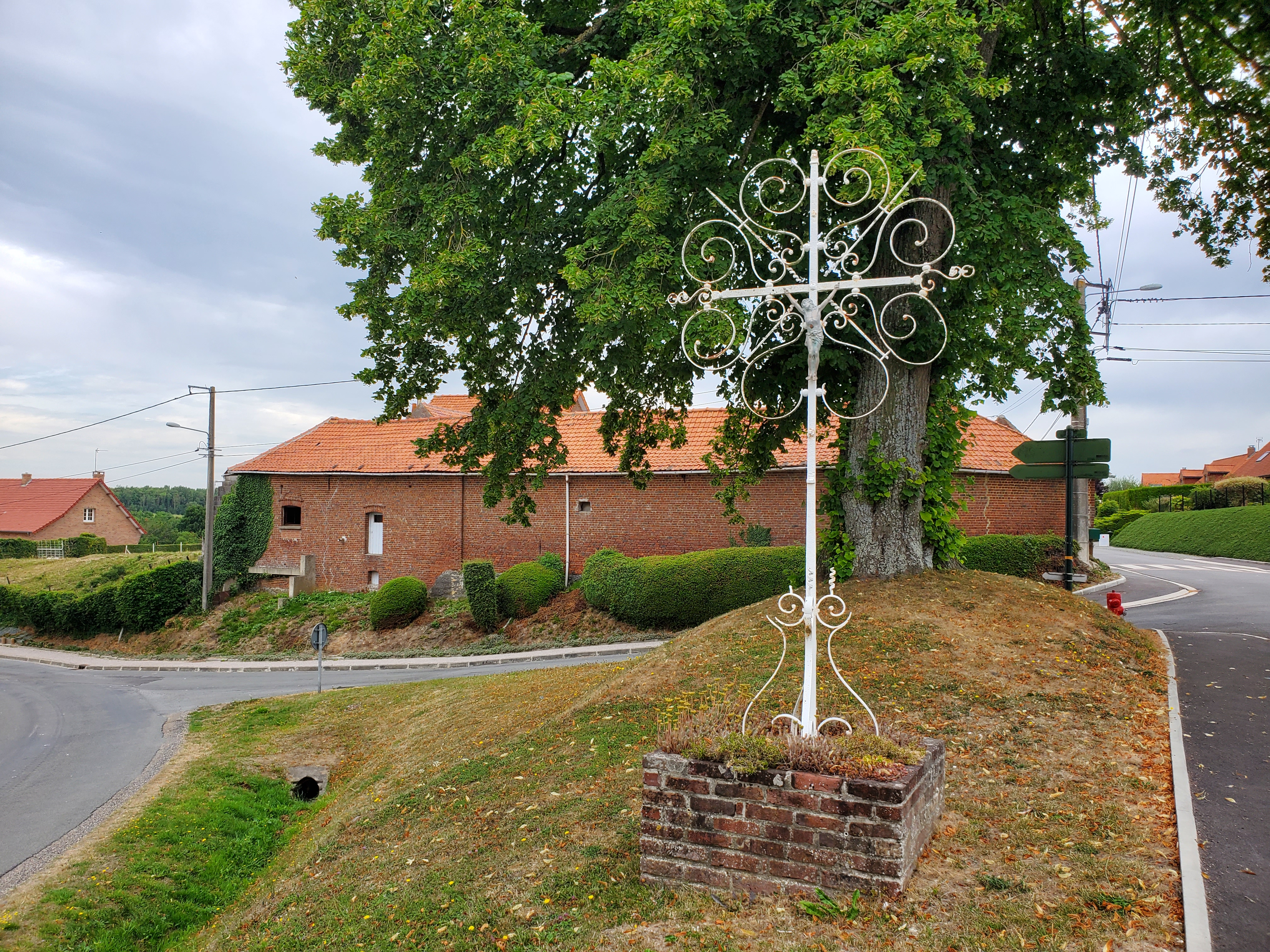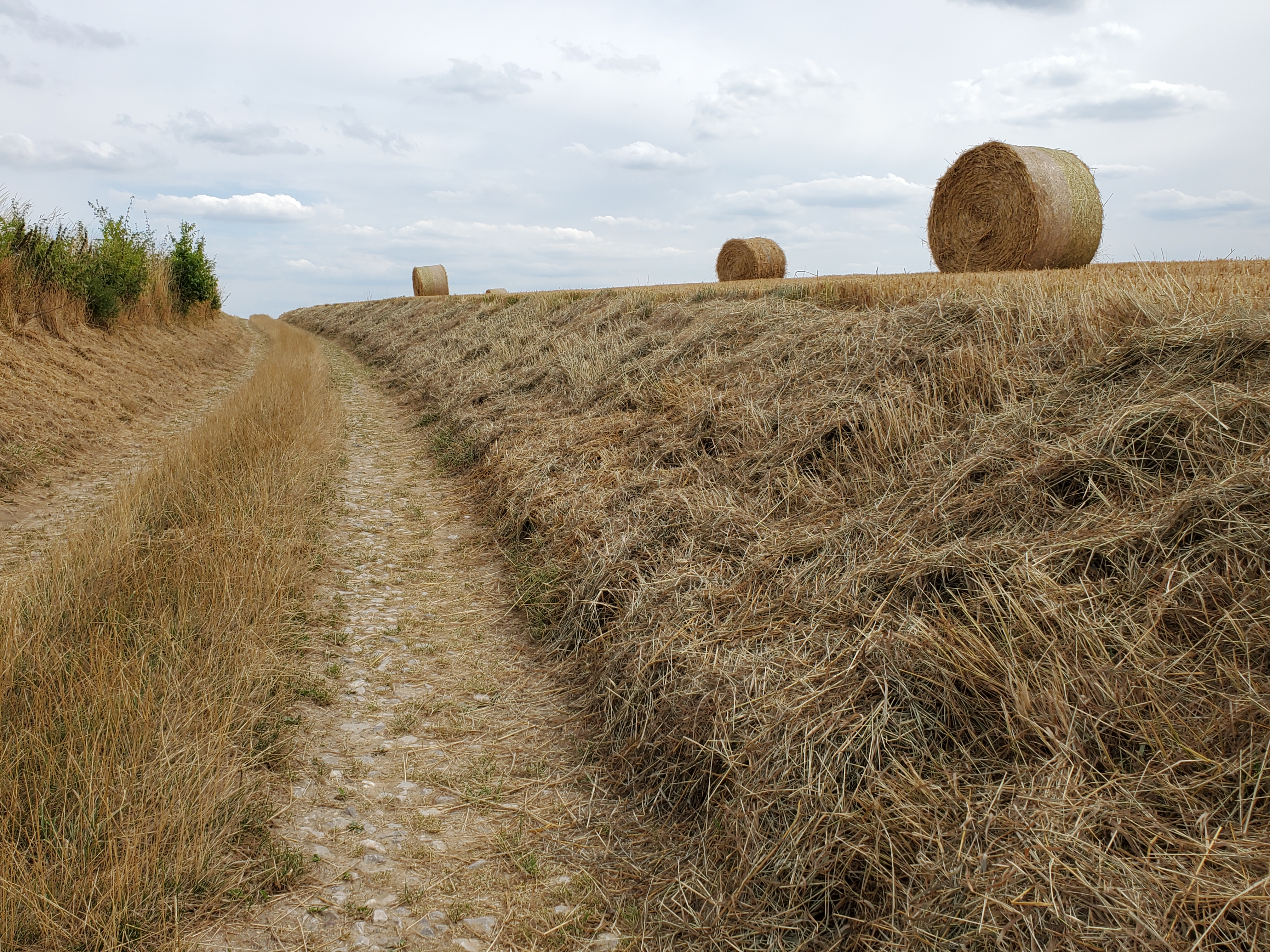 Which way do we go?La Welsch. One heck of a gas station meal. 2 pieces of toast with ham, smothered in cheese sauce and broiled with beer. Heart attack in a bowl.This is a gas station??? It actually has charm…and a bar. Which Ken took advantage of.Crucifixes in some form or another in every village.Well, they are not shells or yellow arrows but they will suffice.Monkey puzzle tree…have only seen them in Vancouver / Victoria.Local school children pasted these cow pictures onto the wall. We especially liked this evil cow by Hugo. Hugo is most likely a stinker! Kinda like Ken.Our token tourist visit to the Eiffel Tower…or some version thereof.Ken: Yes??? Terry: Non!Call to the John Deere repairman.Incredible hills to climb. Gotta admire the brawn on this guy. Not only is he “poussez”ing the bike, he is “tirez”ing Rawley the Trolley. Ken says pretty good for a fat old man.Passed a “Templar” hotel…and that is a real drawbridge over a moat.Not meaning to be disrespectful by photographing a gravestone but there is such a stark contrast between this and the ancient cemeteries we saw in England.This translates to Hanne Albert, Age 22, shot right here by a German sentry. Ken says at this time of WW2, France had already surrendered to the Germans. So why shoot this young man?Really, Googlemaplady, really???Le random rogue village chicken. Ken was terrified!Our Gite for the night. Ferme de 2 tilleuls. They cater to pilgrims. Tilleuls are linden trees.Ken pretending he knows how to hard boil eggs.Pigeon coop.Melle and Inga, Via Francigena pilgrims from Estonia.Outside the gite. St Joseph…someone tends these as there are often fresh flowers. Ken has yet another brilliant idea (Insert Terry eye roll here). Hang a car deodorizer in his arm pit so he never has to shower. Woe is me.